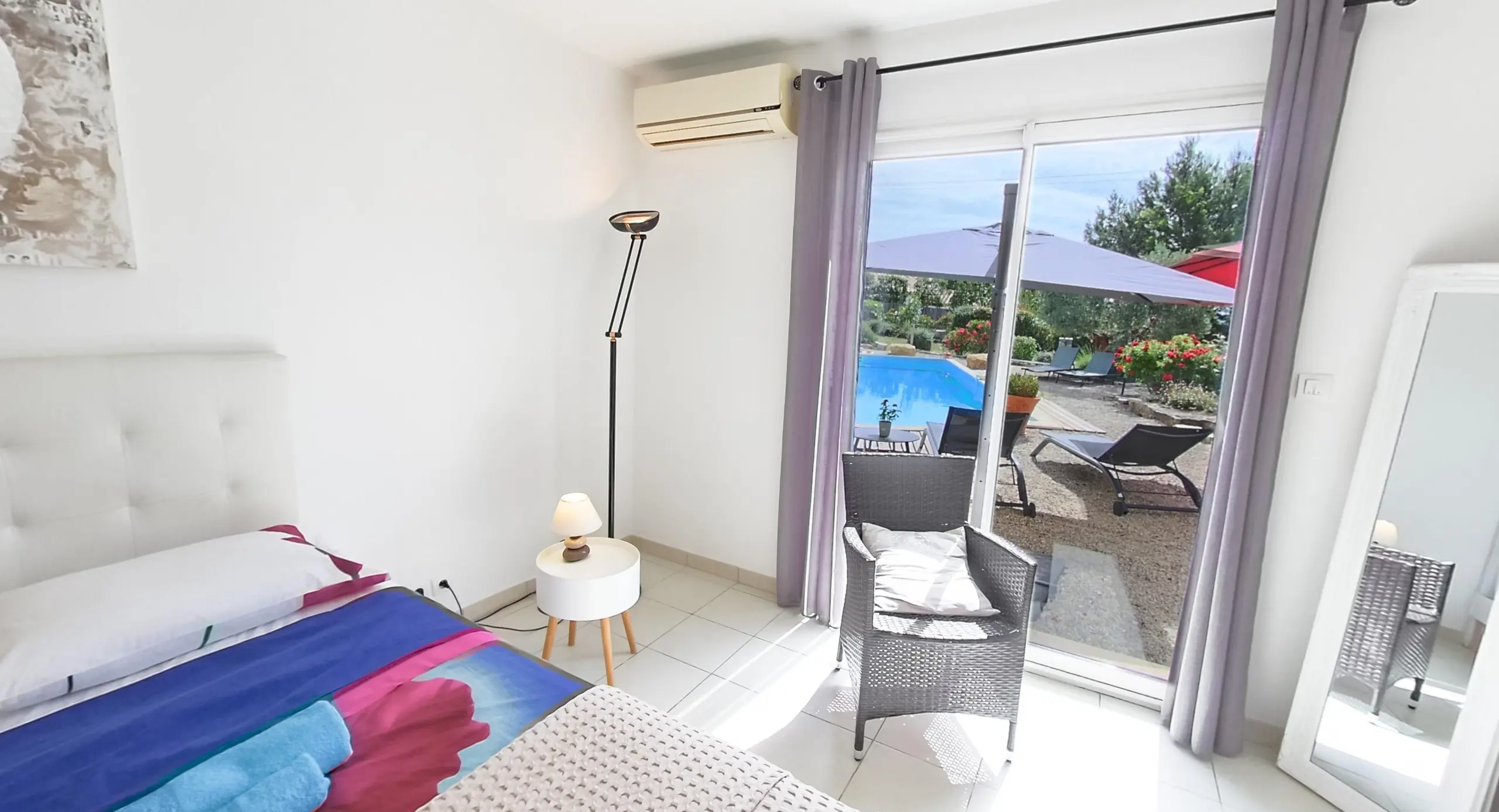 Proche du golfe de Saint-Tropez entre la mer et Lac de Saint Croix et ses gorges, dépendance dans maison provençale pour 6 personnes de 100 mètre carré avec piscine sécurisée 10×5 avec transats et parasols, parking privé de 350 mètre carré utilisable en terrain de pétanque.